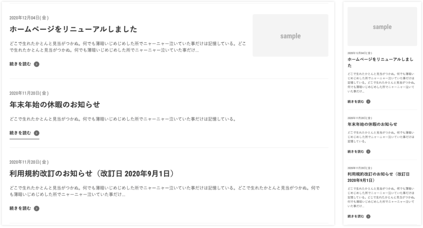 画像がないエントリーも多いことが想定されるお知らせ(news)カテゴリーのインデックスでは、サムネイルがあってもなくても美しくレイアウトされるように工夫されています。CSS Grid が使用されています。