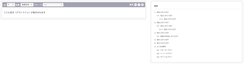 デモデータではユニットによる要素の掲載例の冒頭に使われています。 目次ユニットは a-blog cms の組み込みJSのひとつで、エントリー内の見出し要素に自動でアンカーリンクを生成、表示します。