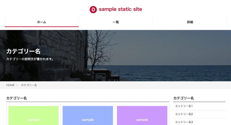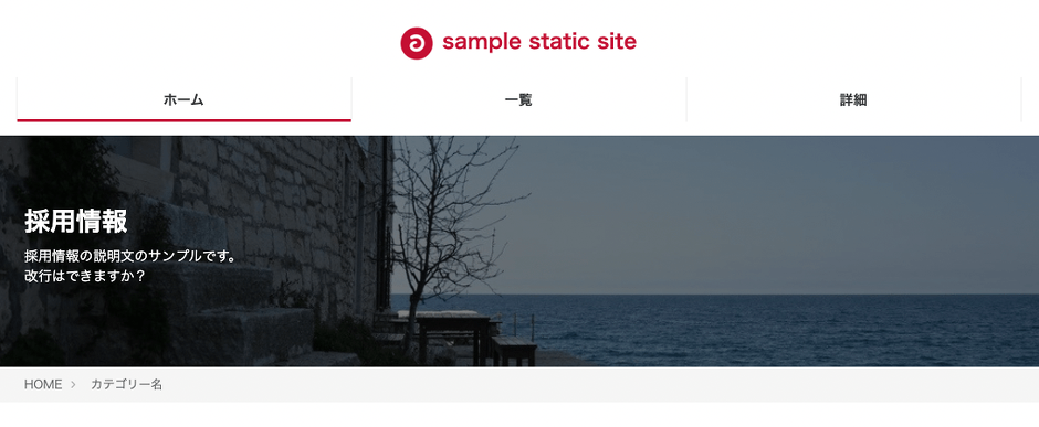 次は list.html と entry.html のヘッダー部分の仕上げを行います。現状は、カテゴリー名と書かれていますが、それぞれのカテゴリー名が編集されるようにします。また、黒い部分には背景画像を設定し、「カテゴリーの説明文が書かれます。」の部分も編集可能にします。