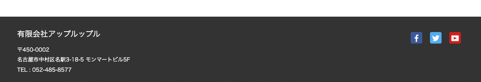 フッター部分は、左側の会社名・郵便番号・住所・電話番号と、右側にある SNSアイコンのリンク先を設定したり、使わないものは消したりできるようにしてみます。