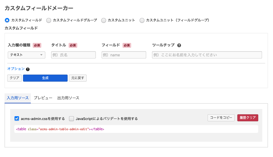 その後、カスタムフィールドメーカーを利用して以下の情報から管理画面のフォームのHTMLを作成します。
