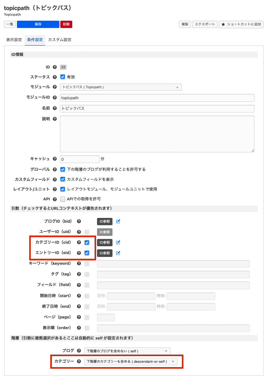 トピックパスモジュールでは、条件設定タブの引数についてカテゴリーとエントリーにチェックをつけるのを忘れないようにしてください。