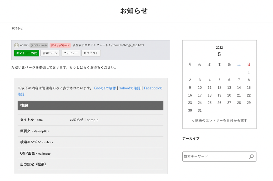 以上でエントリーの移行は完了です。「お知らせ」の子ブログに移動すると、エントリーの情報が表示されているのが確認できます。