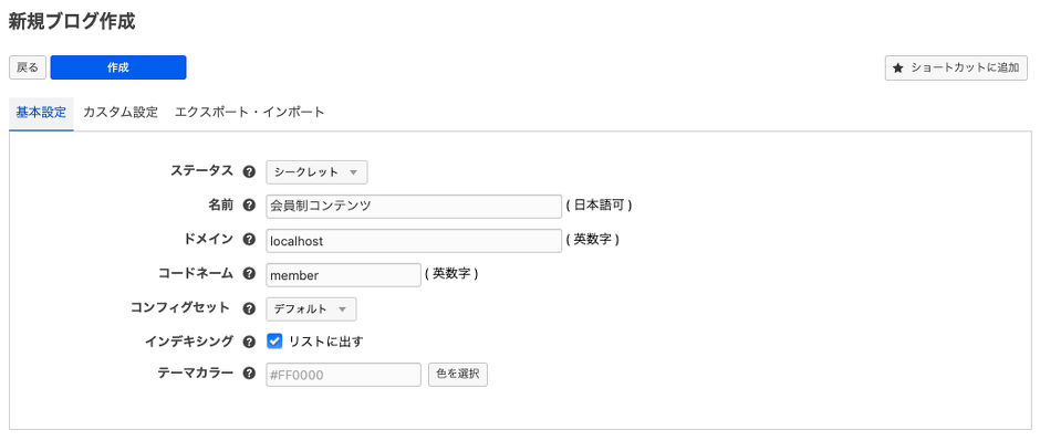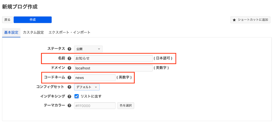 名前を「お知らせ」とし、コードネームを「news」に設定ください。