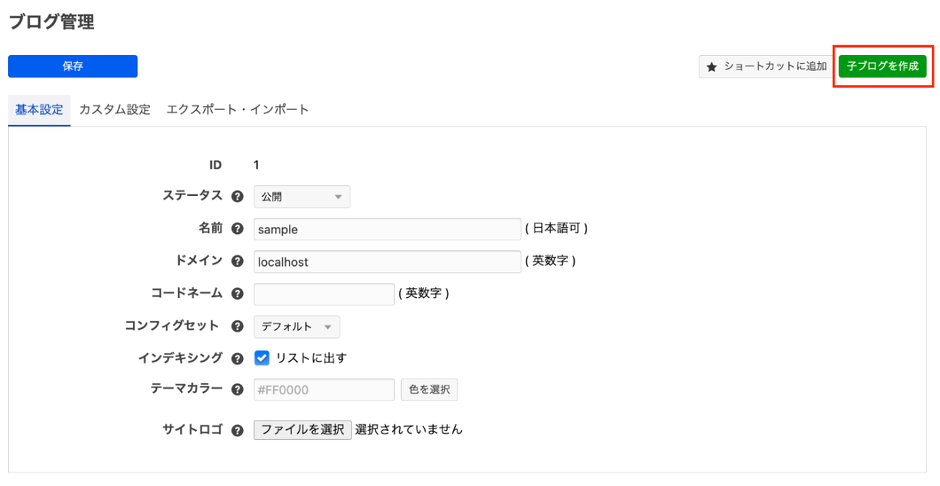 次に ブログ管理の画面 より、右上にある緑色の 子ブログを作成 ボタンをクリックして、新規ブログ作成画面を表示させます。