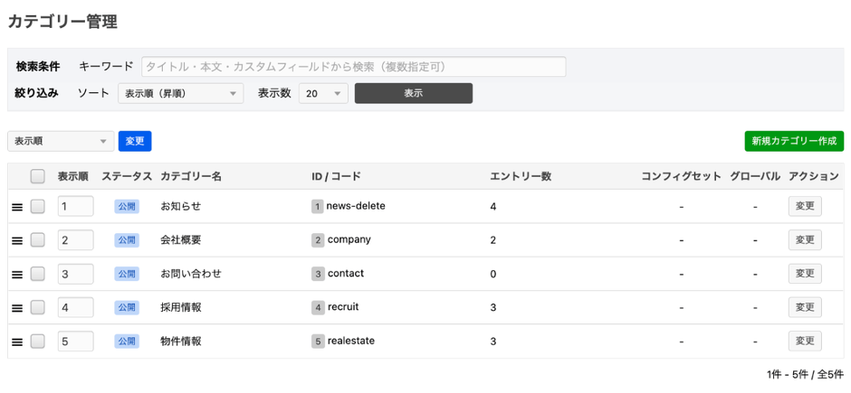 まずは「お知らせ」の子ブログを作成していきます。現在 news というコードはお知らせカテゴリーで使われており、新しく作成する子ブログのコードには使用することができません。そのため、まずはお知らせのカテゴリーコード news を変更します。