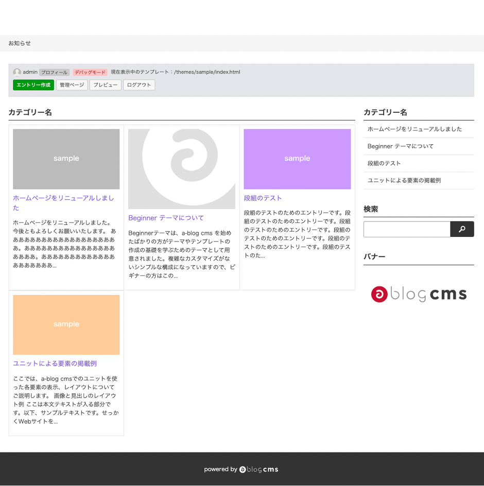 新しく作成した「お知らせ」の子ブログには、初期設定として blog テーマが設定されています。このテーマを変更して、親ブログで利用されている sample のような、お知らせブログ専用のテーマを作成し設定します。