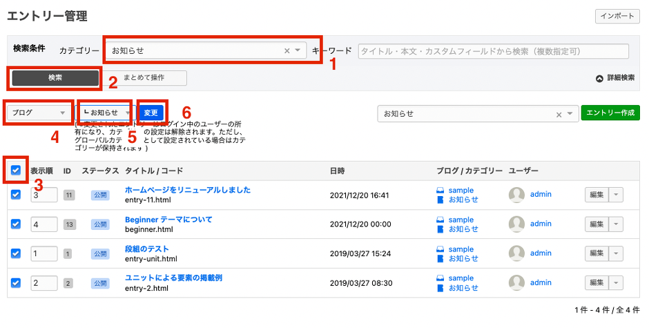 親ブログ内にある「お知らせ」のエントリーをまとめて子ブログ側に移動します。親ブログのエントリー管理画面から絞り込み機能を利用して、「お知らせ」エントリーを一覧表示してください。
