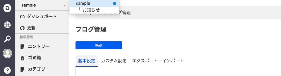 以上でお知らせブログが作成できました。URLは http://localhost/news/ になります。 ブログ管理の画面でブログ間の移動は可能ですが、管理画面の左上にあるブログ名をクリックすると、親ブログと子ブログを切り替えることも可能です。
