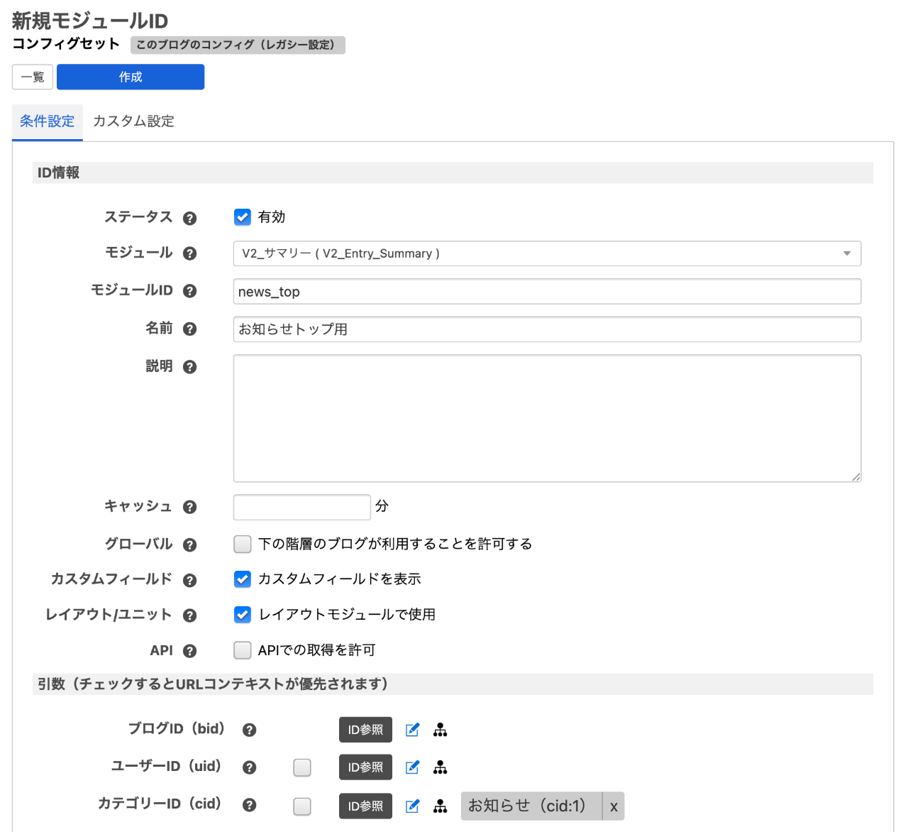モジュールIDを作成して表示条件(カテゴリー・件数)を設定する