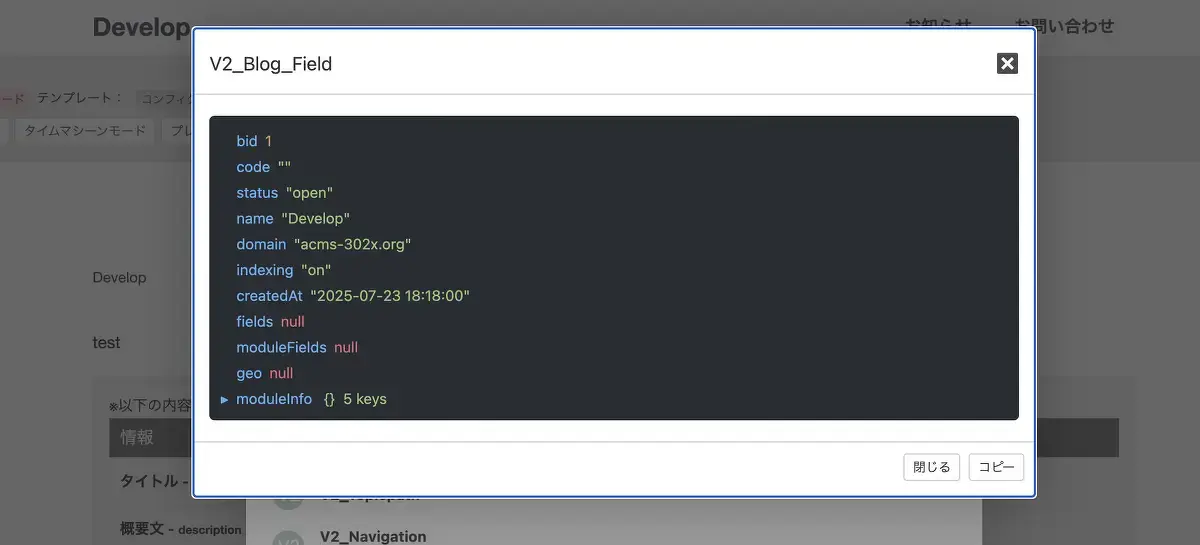 この変数はログイン中の管理者に対してのみセットされます。内部ではブログID(bid)・モジュールID(mid)・管理画面の設定URL(url)・モジュールクラス名(name)・モジュールID(identifier)などが格納されており、admin/module/setting.twig に渡すことで、閲覧画面からモジュールIDの設定画面へ遷移する「編集」リンクを表示できます。一般ユーザーが閲覧する場合は moduleInfo は空となり、編集リンクは表示されません。
