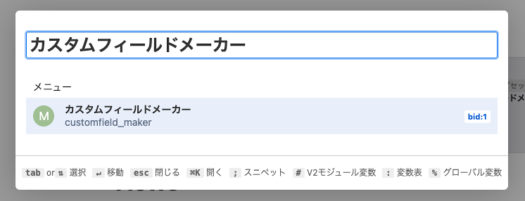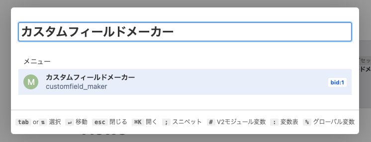 クイックサーチ機能を利用することでカスタムフィールドメーカーのページに移動することができます。MacOSであれば ⌘ + k 、Windows であれば Ctrl + k でクイックサーチを表示して「カスタムフィールドメーカー」と入力し、Enter キーを押下するか、メニュー内の「カスタムフィールドメーカー」をクリックしてください。