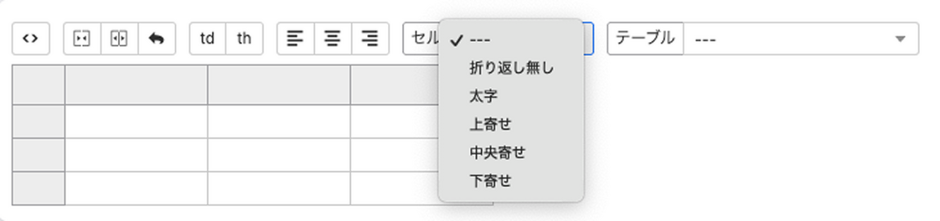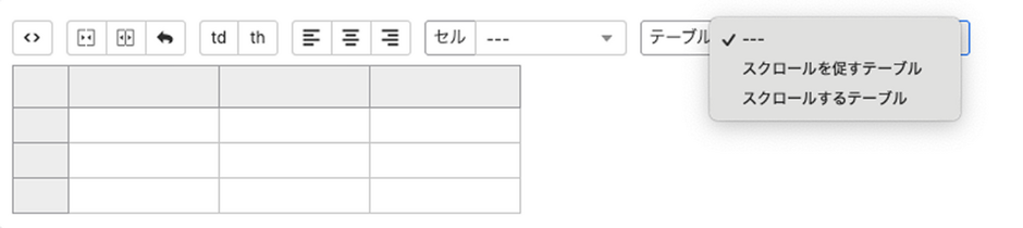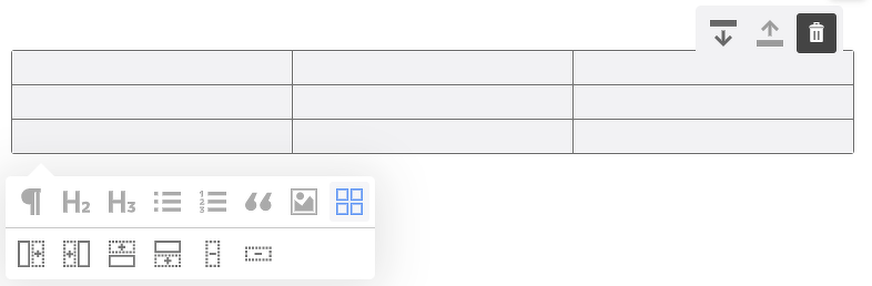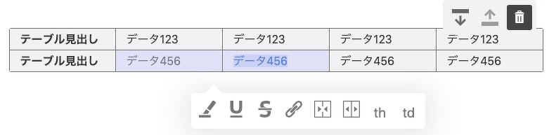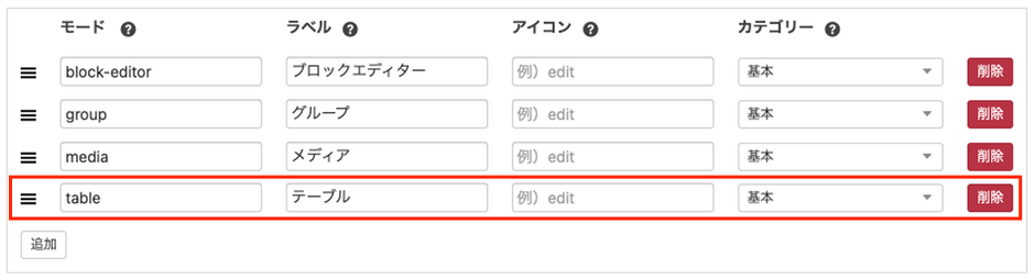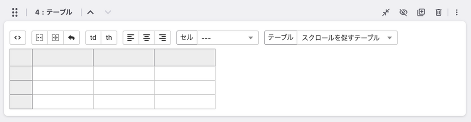 };以下のような見た目のブロックが出現し、行の追加・削除、列の追加・削除などテーブルを編集できるようになります。