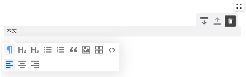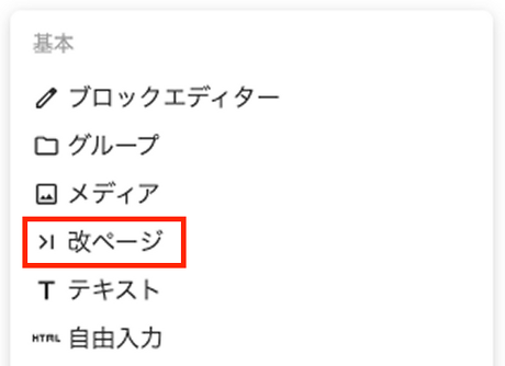 デフォルトでは、本文ブロック、見出し2ブロック、見出し3ブロック、リストブロック、番号付きリストブロック、引用ブロック、メディアブロックが利用できます。