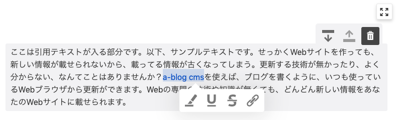 また、リッチエディターでは以下の画像のように、インライン装飾をするための仕組みがあります。デフォルトでは、強調、アンダーライン、打ち消し線、リンクの装飾を施すことができます。