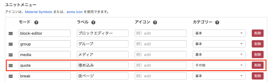 埋め込みユニットを利用するには管理画面のコンフィグ > 編集設定画面から設定をする必要があります。下の図のように追加ボタンを押し、モードから埋め込みを選択し、それに対するラベルの名前を決めてください。ラベルの名前は任意です。保存をすれば設定したラベル名のついたボタンがエントリーの編集画面で使えるようになります。