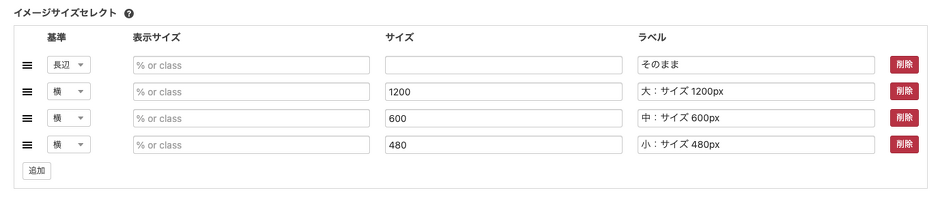 下の図のように、セレクトメニューに対してそれぞれのサイズにラベル付けを行うことができます。