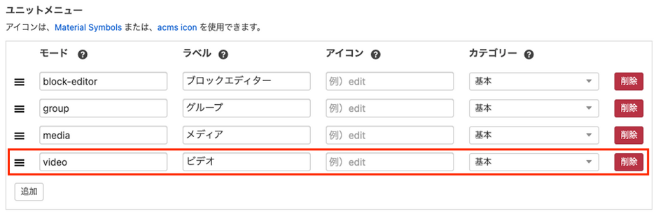 引用ユニットを利用するには管理画面 > 編集画面 > 編集設定から設定をする必要があります。下の図のように追加ボタンを押し、モードからビデオを選択し、それに対するラベルの名前を決めてください。ラベルの名前は任意です。保存をすれば設定したラベル名のついたボタンがエントリーの編集画面で使えるようになっています。