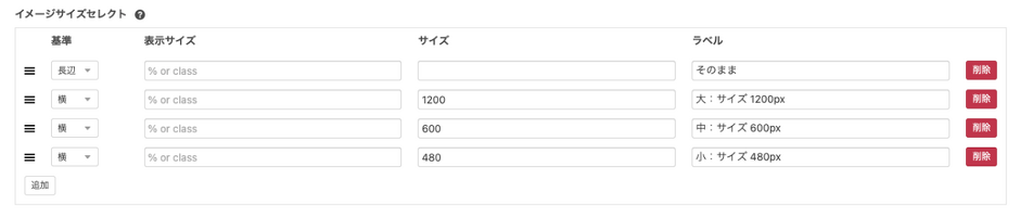 エントリー内で表示する際の表示サイズを指定できます。 管理ページ > コンフィグ > 編集設定 にある「サイズセレクトのイメージサイズ選択肢」で指定した内容が選択肢として表示されます。