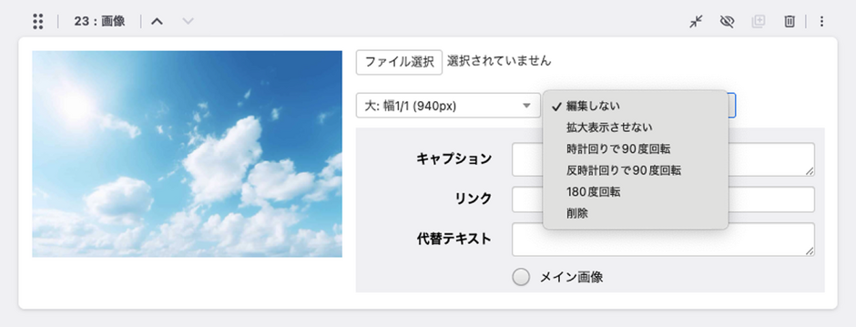 画像の簡単な編集として、画像の拡大禁止と回転を指定できます。 人物が写っている画像など、拡大して詳細を見せたくないという場合には「拡大表示させない」を選択すると、画像を表示する際に拡大リンクが無い状態となります。また、管理ページ > コンフィグ > 編集設定 にあるイメージサイズの「拡大表示時の最大サイズ」で指定したサイズの画像も作成されません。