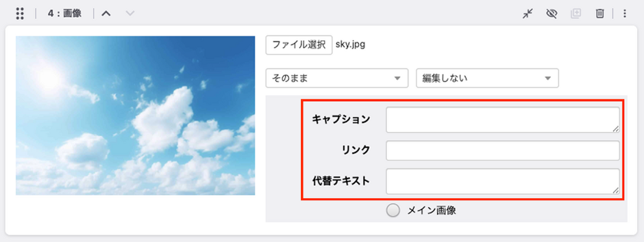 - (詳細設定として)キャプション、リンク、代替テキストの指定