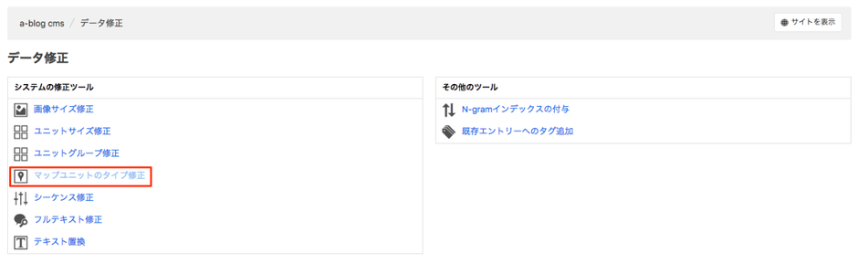Ver.2.9では、APIの使用回数の制限から、地図(Google Map)ユニットがこれ以上使えなくなった場合の対策として、すでに登録済みのユニットを地図(Open Street Map)ユニットに一括で変換する機能を用意しています。 変換したい場合は、下の図のように編集画面より、データ修正 > マップユニットのタイプ修正 と進んでください。