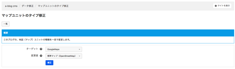 その後、ターゲットに「GoogleMaps」変更値に「標準マップ(Open Street Map)」を選択して修正ボタンを押すことで既存の地図(Google Map)ユニットが全て地図(Open Street Map)ユニットに変換されます。