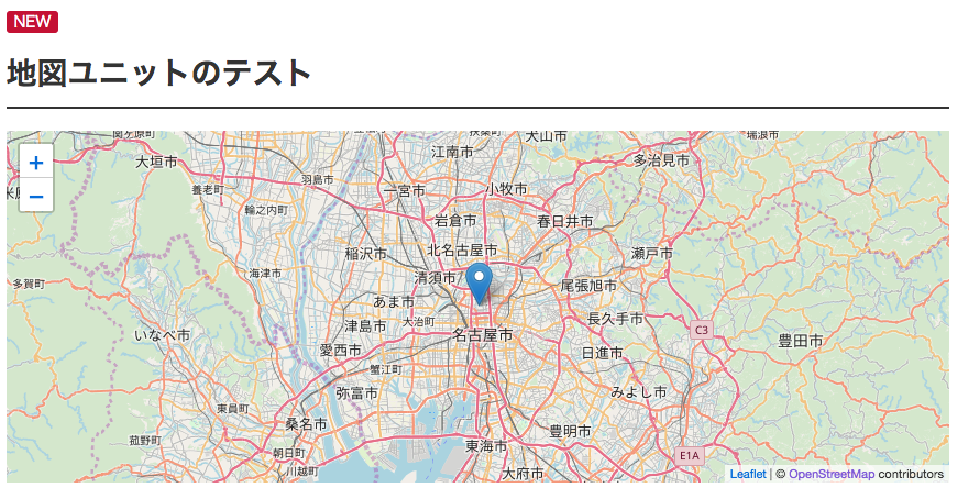 表側のページでの表示は、以下のようになります。地図(Google Map)ユニットとは違い、静止画ではないため、表示にはJavaScriptが動作することが前提となります。