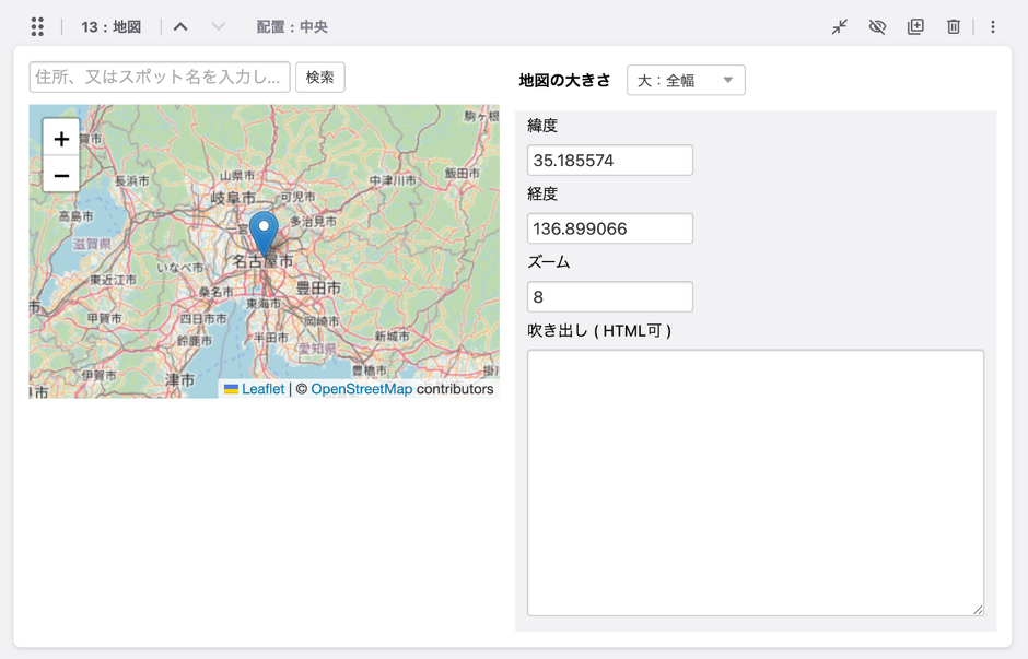 Ver. 2.9より、地図(Open Street Map)ユニットが使用できるようになりました。 地図(Open Street Map)ユニットは、下の図のように緯度と経度または住所を入力すると該当の箇所の地図をOpen Street Mapを用いて表示するユニットです。 Ver. 2.8 までは地図(Google Map)を表示する場合、API Key が必要になります。Google Mapsは制限が厳しくなり クレジットカード を登録しないと表示できない場合も出てきました。こういったAPI的な制限を回避したい場合は地図(Open Street Map)ユニットを使うことをおすすめします。 下の図のように、地図(Google Map)ユニットと同じようなインターフェースとなっています。