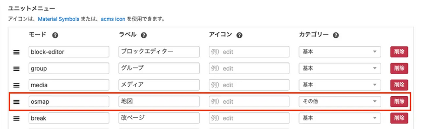 地図ユニットを利用するには 管理画面 > 編集画面 > 編集設定 から設定をしてください(新規インストール時には、すでに地図ユニットの設定はあるはずです)。図の下に位置している追加ボタンをクリックし、モードから「標準マップ」を選択し、それに対するラベルの名前を決めてください。保存をすれば設定したラベル名のついたボタンがエントリーの編集画面で使えるようになります。