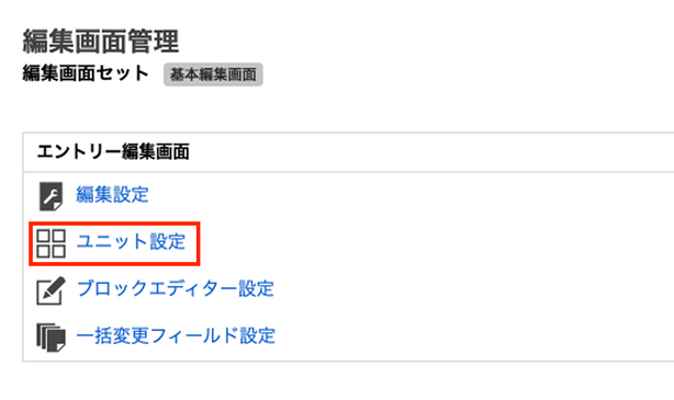 [ユニット設定]画面を表示するには、編集画面 > 基本編集画面 > ユニット設定 へ進みます。
