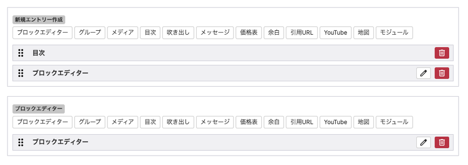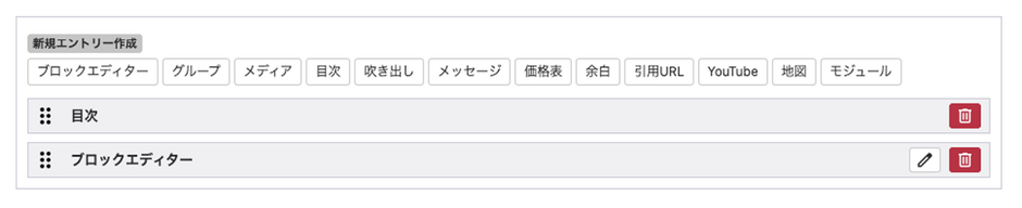 ユニット編集画面では、エントリー作成時に使用する「テキスト」「画像」などの各ユニットボタンをクリックした時に表示される情報の入力枠を編集できます。これらは 管理ページ > コンフィグ > 編集設定 の「ユニット追加ボタン」で追加したものが表示され、編集できます。以下、各ユニットに共通の追加・削除について説明します。