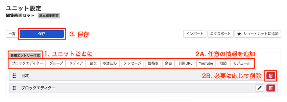 (1)[ユニット設定]画面の各ユニット(テキスト、画像など)で入力枠の追加・削除などの設定をおこない、[保存]ボタンをクリックします。
