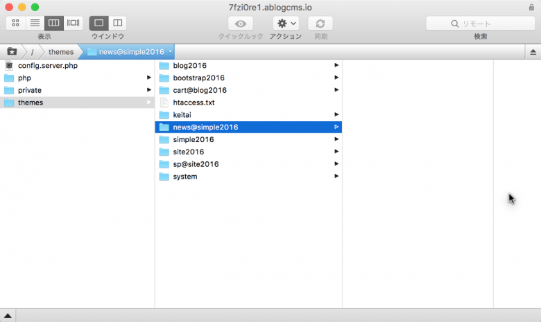 メインのテーマが /themes/simple2016 を利用していますので、お知らせ(news)のテーマは news@simple2016 というテーマ名にします。 /themes/news@simple2016 という空のフォルダを用意してください。