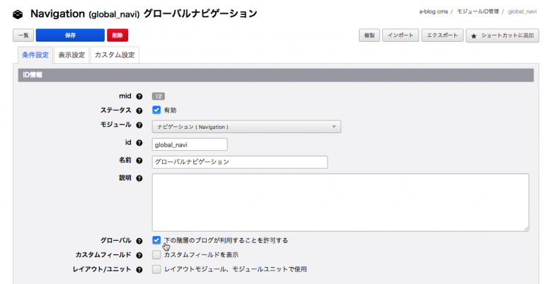 モジュールID は、初期状態では設定されているブログの中でのみ利用ができるようになっています。しかし、グローバル化することで、下の階層のブログでも利用する事ができるようになります。