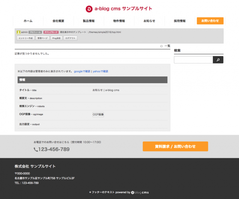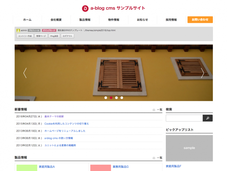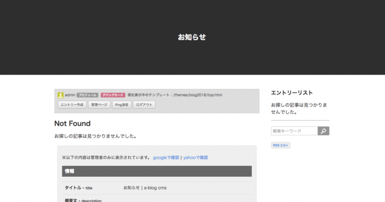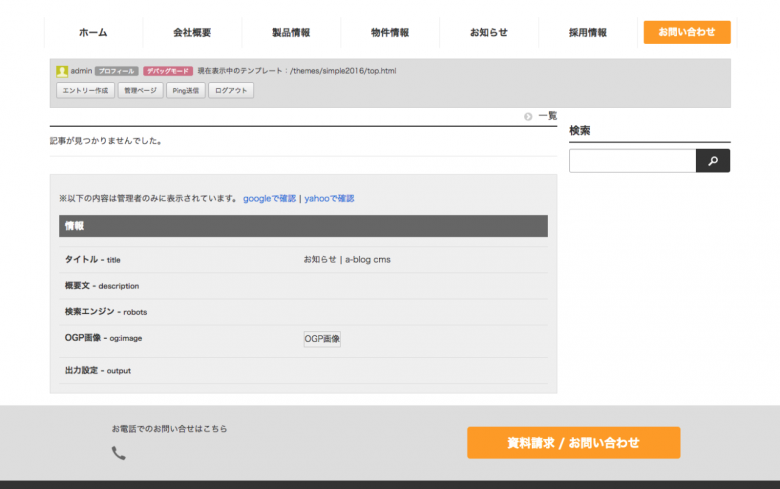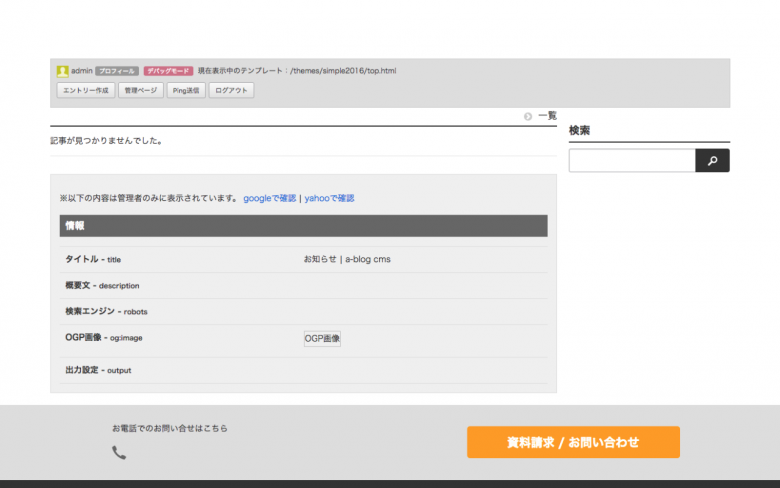 また、表示中のテンプレートは /themes/simple2016/top.html という表示になっています。 news@simple2016 のフォルダ内は空ですので、親テーマ側の simple2016 のファイルが利用されます。