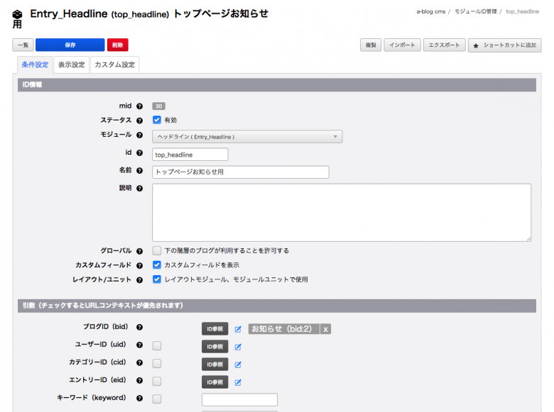 管理ページ > モジュールID から Entry_Headline id="top_headline" の設定を変更します。当初はカテゴリーがお知らせ(cid:2)と指定されていたところを、ブログをお知らせ(bid:2)に変更します。