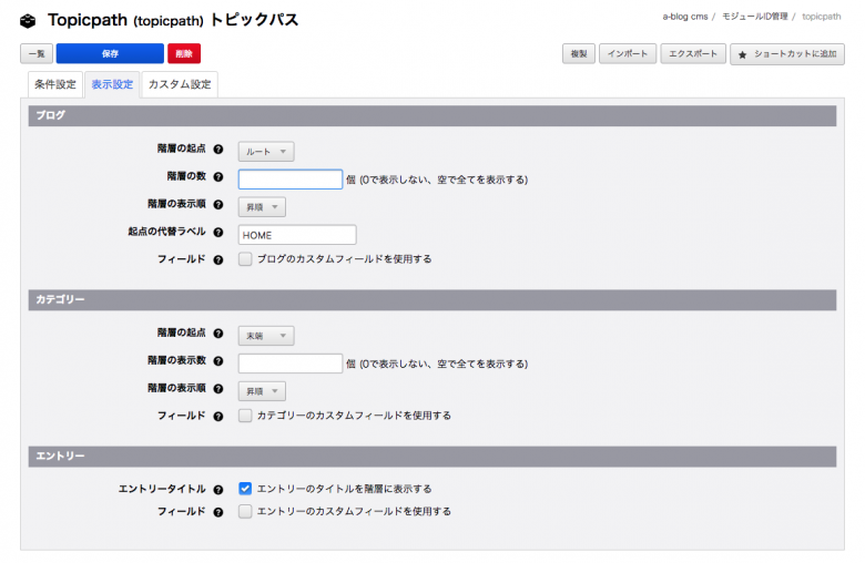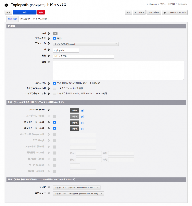 管理ページ > モジュールID から TopicPath id="topicpath" の設定を変更します。 グローバル化し、条件設定で階層の設定を確認してください。「下階層のブログも含める」「下階層のカテゴリーも含める」と設定しておかないと、トピックパスの階層構造を表示できませんので注意して下さい。