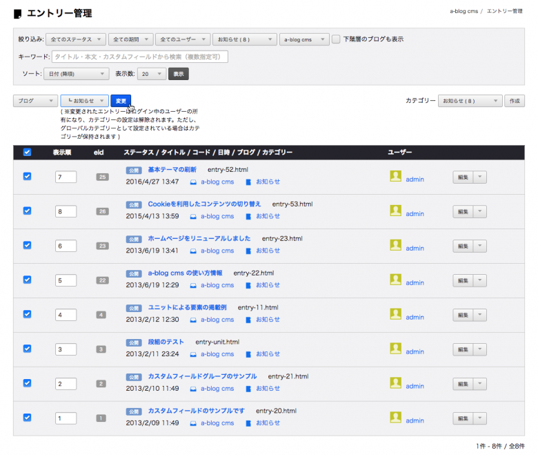 管理ページ > エントリー管理 を利用して記事をまとめて子ブログ側にエントリーを移動します。絞り込み機能を利用してカテゴリーの「お知らせ」を選択して検索してください。