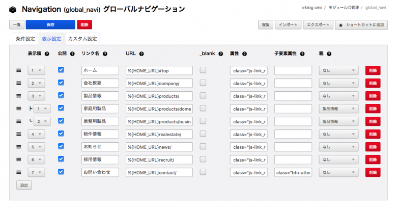 管理ページ > モジュールID から Navigation id="global_navi" の設定を確認してみると URL に %{BASE_URL} というグローバル変数が指定してある事で、子ブログで利用する際にURLがおかしくなっています。 %{HOME_URL} に変更します。