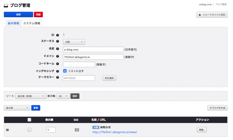 次に 管理ページ > ブログ より、ブログの管理ページから右下にある 子ブログを作成 をボタンクリックし コードネーム news でブログを作ります。