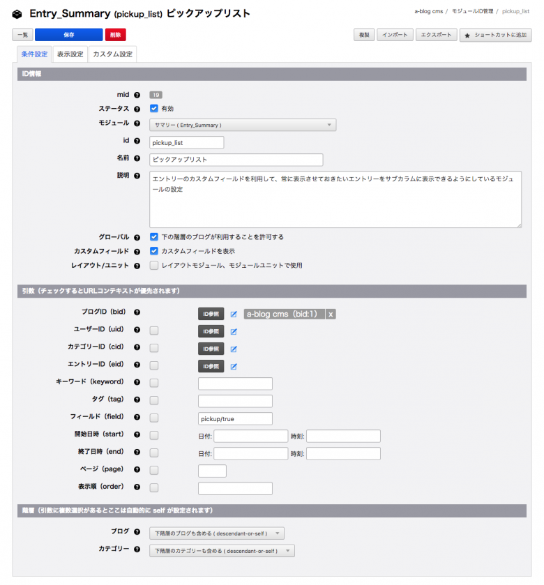 管理ページ > モジュールID から Entry_Summary id="pickup_list" の設定を変更します。ブログID(bid)の設定と、階層の設定を変更し、下層のブログも含めると指定する事で、お知らせの子ブログのエントリーにチェックがあった際にも表示されるように指示しておきます。