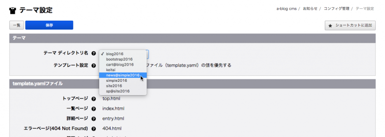その後、管理ページ > コンフィグ > テーマ設定 で news@simple2016 を選択して保存してください。