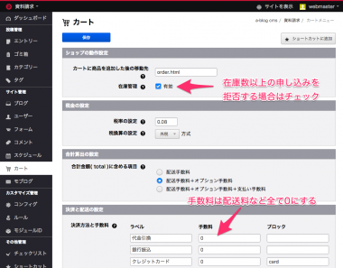 作成した小ブログの管理ページ > カート よりカート機能を有効に設定します。