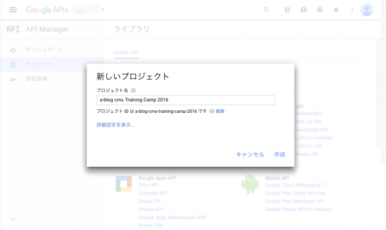任意のプロジェクト名をつけてください。入力後、「作成」リンクをクリックします。