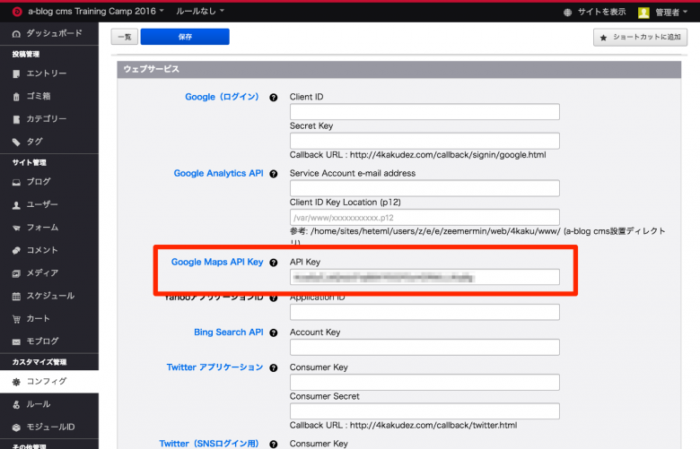 a-blog cms の管理画面>コンフィグ>プロパティ設定の「Google Maps API Key」の項目に、先ほどコピーした文字列をペーストしてください。