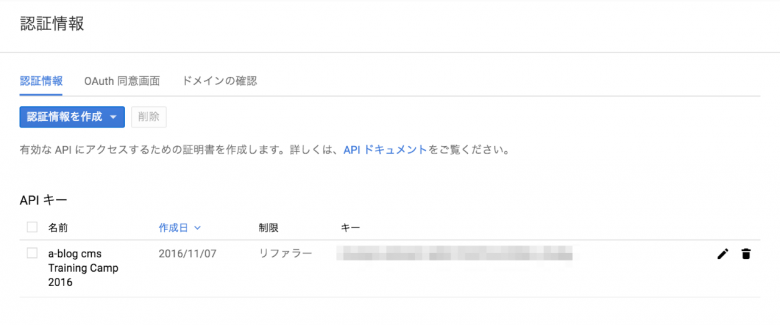 「認証情報」画面の項目「キー」に API Key が表示されます。この文字列をコピーしてください。