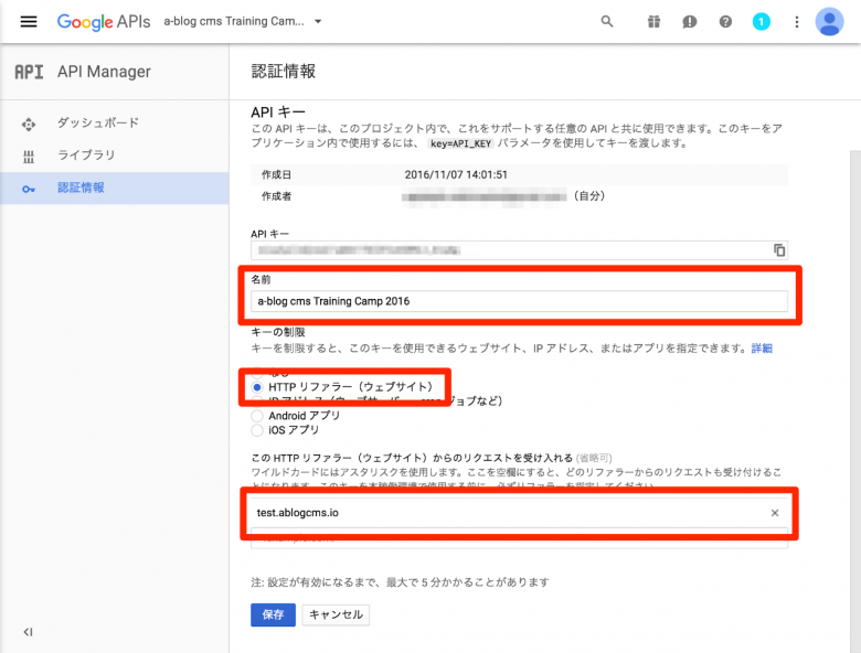 | 名前 | 任意のAPI Key名を入力してください。 |