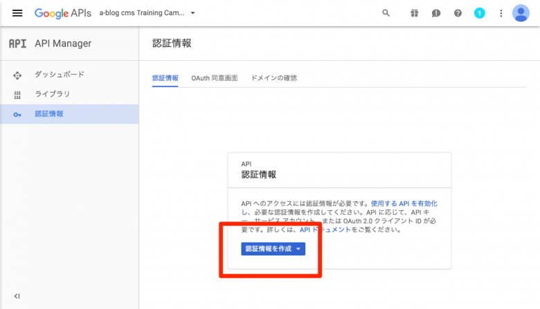 左メニューの「認証情報」をクリックし、「認証情報を作成」ボタンをクリックします。