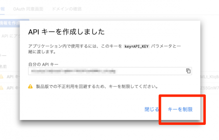 「APIキーを作成しました」というポップアップが表示されます。「キーを制限」リンクをクリックしてください。